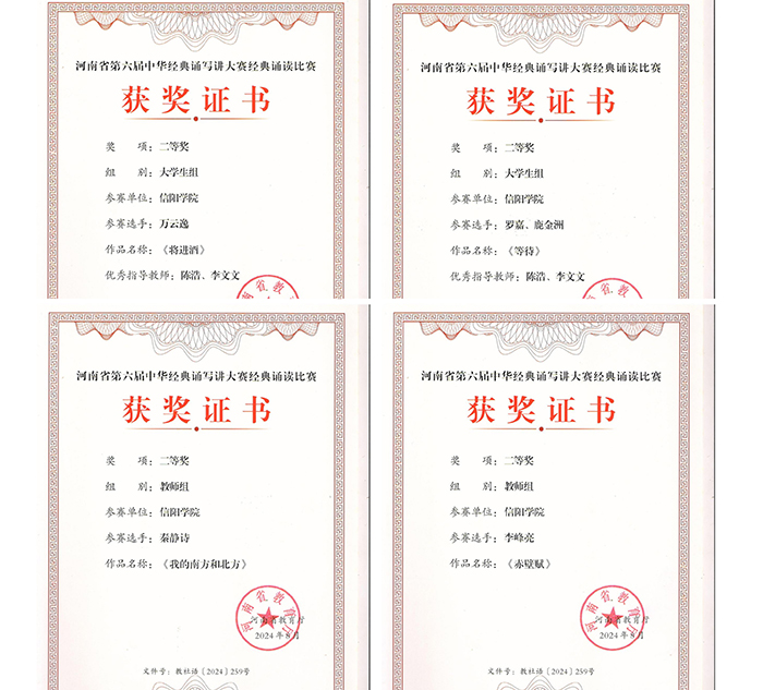 近日,第六届中华经典诵写讲大赛圆满落幕,Beat365师生在此次比赛中表现出色,其中文学院教师李峰亮朗诵作品《赤壁赋》、秦静诗朗诵作品《我的南方和北方》荣获教师组二等奖,文学院学生罗嘉、鹿金洲朗诵作品《等待》,万云逸朗诵作品《将近酒》荣获大学生组二等奖。