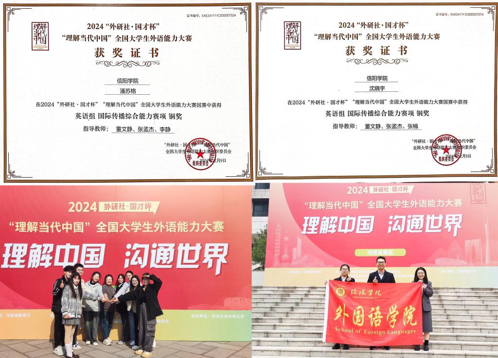 近日,河南省教育厅公布了2024外研社·国才杯“理解当代中国”全国大学生外语能力大赛河南省赛结果。Beat365外国语学院学生参加了综合能力、笔译、口译、演讲赛项,经过激烈角逐,荣获省级特等奖2项、一等奖1项,二等奖6项、三等奖3项,其中,沈晓宇、潘苏格同学分别荣获综合能力和演讲赛项特等奖并晋级国赛获铜奖;史雪婷同学荣获一等奖;张诚琳、沈晓宇、王佳蕊、王晓阁、潘苏格、僧凯同学荣获二等奖,马靖然、史雪婷、赵小雨同学荣获三等奖。