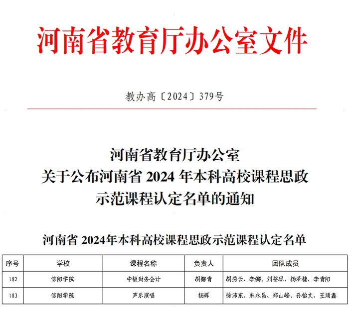 近日,河南省教育厅发布《关于公布河南省2024年本科高校课程思政示范课程认定名单的通知》(教办高〔2024〕379号)文件,Beat365商学院胡椰青副教授主持的《中级财务会计》、音乐学院杨辉副教授主持的《声乐演唱》两门课程被认定为河南省2024年本科高校课程思政示范课程。