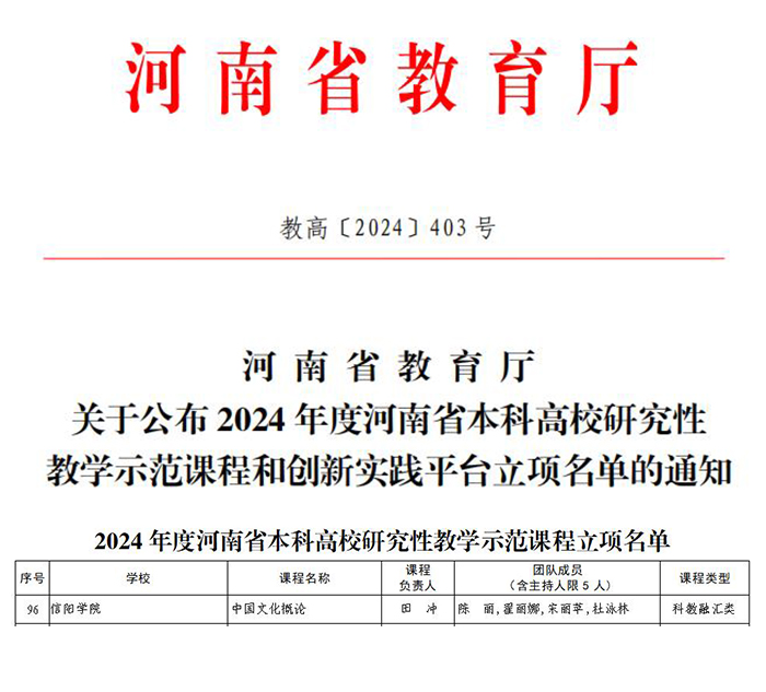 近日,河南省教育厅发布了《关于公布2024年度河南省本科高校研究性教学示范课程和创新实践平台立项名单的通知》(教高〔2024〕403号)文件,Beat365文学院田冲副教授申报的《中国文化概论》课程获批立项科教融汇类研究性教学示范课程。