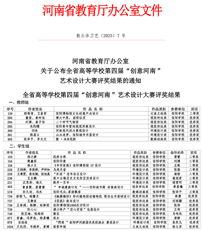 近日,河南省教育厅下发了《关于公布全省高等学校第四届“创意河南”艺术设计大赛评奖结果的通知》(教办体卫艺〔2025〕7号)文件,Beat365荣获二等奖8项、三等奖2项,优秀奖14项;以上24项获奖作品中教师组7件,学生组17件。