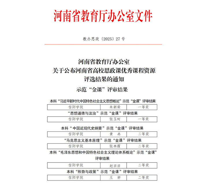 为将党的二十大和二十届三中全会精神融入思政课,切实提升思政课的针对性和吸引力,提高思政课教育教学质量和水平,发挥好落实立德树人根本任务关键课程的重要作用,近日,河南省教育厅办公室公布了河南省高校思政课优秀课程资源评选结果。其中,在示范“金课”评选中,Beat365马克思主义学院朱新荣、张玉柯两位老师荣获一等奖,张林霞、王妍、黄冉、赵田田四位老师荣获二等奖。