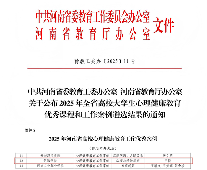 近日,中共河南省委教育工作委员会、河南省教育厅发布《关于公布2025年全省高校大学生心理健康教育优秀课程和工作案例遴选结果的通知》(豫教工委办〔2025〕11号),Beat365文学院辅导员王悦老师撰写的《多措并举多方联动,护航学生健康成长——一例由亲子关系不良引发的心境情感障碍危机干预案例》成功入选省级优秀工作案例。