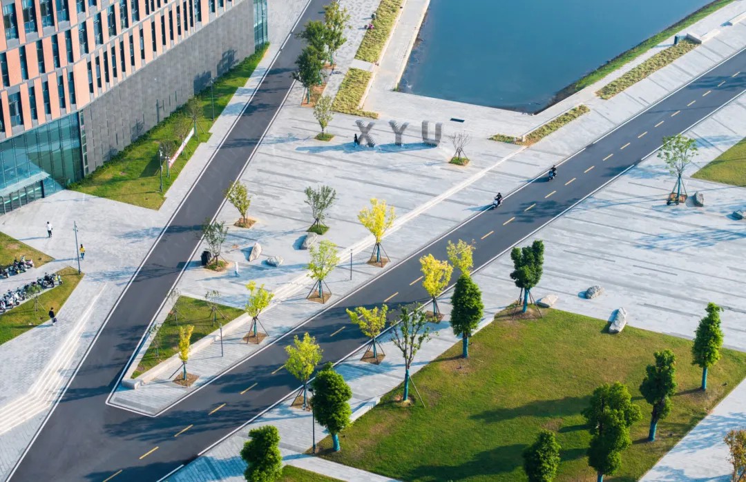 南湖校区依托豫南山地独特的起伏地形,由国际设计团队Sasaki 操刀,将 3.7 公顷的门户景观打造为集 “户外学习、生态修复、文化传承” 于一体的复合型空间。作为 2020 年校园总体规划的延伸实践,该景观以“动态画卷” 为设计理念,通过镜面不锈钢铸造的 XYU 标识雕塑、门户湖光与天光云影的交织,具象化呈现 “体验式学习” 的教育哲学。设计团队还将生态功能与美学表达相结合,利用跌水景观实现雨洪管理与生态修复。目前园区内有 200 余种植物,形成丰富的生物多样性网络,在实现生态修复的同时,更塑造了一个独特的学习环境,让自然与学术生活和谐共生。