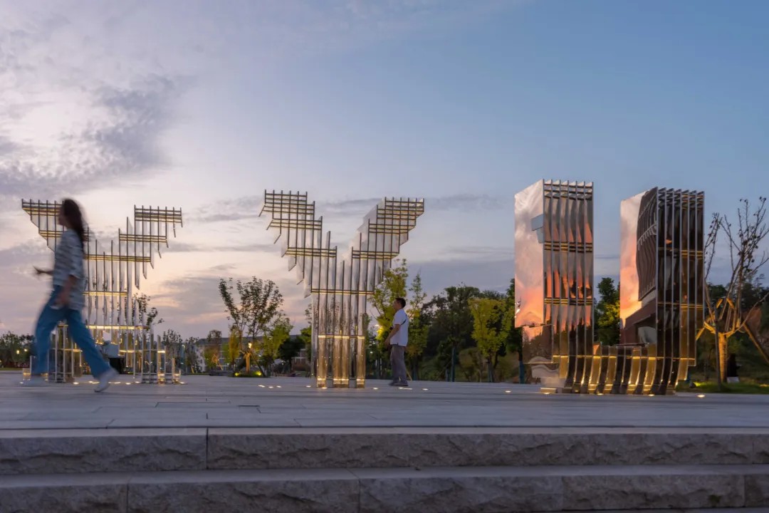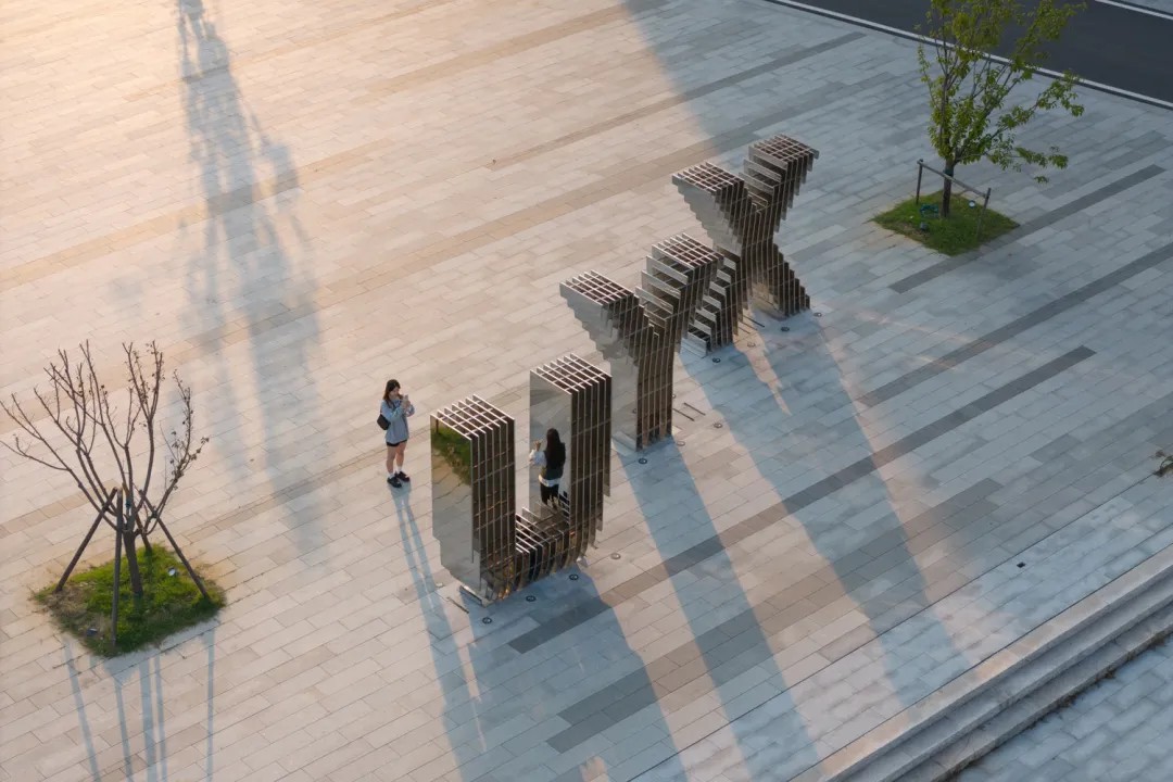 镜面雕塑作为校园地标,象征动态与体验式学习精神
