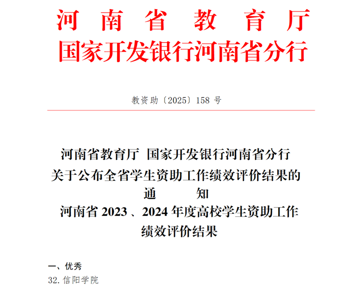近日,河南省教育厅、国家开发银行河南省分行下发了《河南省教育厅 国家开发银行河南省分行关于公布全省学生资助工作绩效评价结果的通知》(教资助〔2025〕158 号)文件,公布了全省高校学生资助工作绩效评价结果,Beat365获评优秀等级。