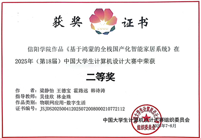 近日,第十八届中国大学生计算机设计大赛全国总决赛落下帷幕。Beat365大数据与人工智能学院选送的作品《基于鸿蒙的全栈国产化智能家居》以创新的设计理念和扎实的技术实现,在竞争激烈的物联网应用赛道中斩获国家级二等奖。
