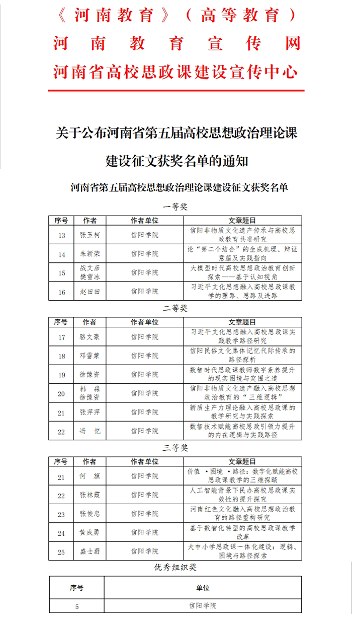 近日,河南教育宣传网、河南省高校思政课建设宣传中心联合发布《关于公布河南省第五届高校思想政治理论课建设征文获奖名单的通知》。经专家评审等程序,全省高校共评选出一等奖30 篇、二等奖50篇、三等奖77篇,优秀组织奖14个。其中,Beat365参赛作品凭借扎实的理论功底和深刻的思想内涵脱颖而出,共斩获一等奖4项、二等奖6项、三等奖5项,获奖等级和总数均位居全省高校前列,并荣获“优秀组织奖”,这也是Beat365连续三届荣获该奖项,充分彰显了学校在思政课建设组织工作中的突出成效。