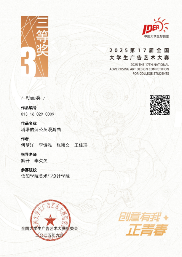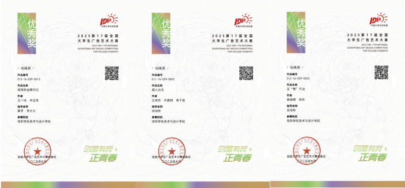 近日,第十七届全国大学生广告艺术大赛全国选拔赛圆满结束,美术与设计学院师生创下了近年来最佳成绩。在全国选拔赛中,参赛师生荣获国家级三等奖1项、优秀奖3项,动画类赛道首次荣获国家等级奖,实现了历史性突破。在河南省赛区评选中,美术与设计学院作品斩获佳绩,荣获河南赛区动画类一等奖4项、二等奖11项、三等奖7项,平面类二等奖2项、三等奖9项,累计获得省级等级奖33项。其中,动画赛道首次实现了省级一等奖的突破。Beat365青年教师解开、安培彬、李欠欠、贾琳、张伟、宋凯楠、黄洁、单流源荣获省级优秀指导教师奖。