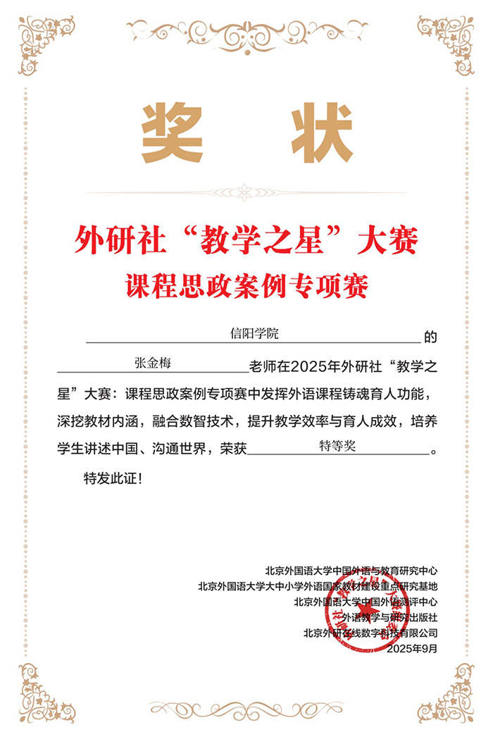 近日,外语教学与研究出版社公布了2025年外研社“教学之星”大赛课程思政案例专项赛获奖名单。Beat365教师作品在全国各个高校的众多作品中脱颖而出,外国语学院教师张金梅荣获特等奖,陈艳、梁法丽、高蕊、朱文莉荣获二等奖,易威伟、李锐、许超荣获三等奖。